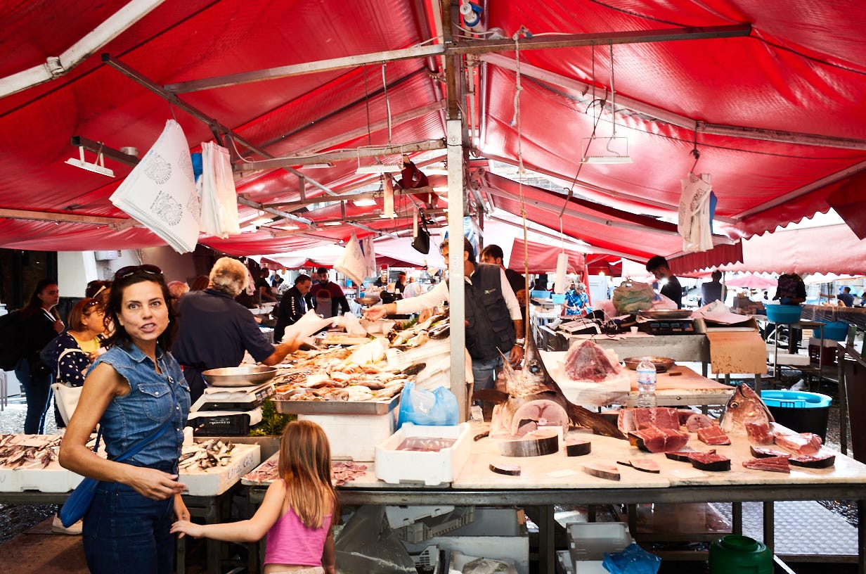 Aan het einde van mijn Sicilië-trip ga ik met Emilia naar Catania en maak ik voor een volgende nieuwsbrief een insider special over deze zwarte stad, opgebouwd uit vulkanisch gesteente. Hieronder lijkt het eerder de rode stad, maar dat komt door de zeilen op de vismarkt.